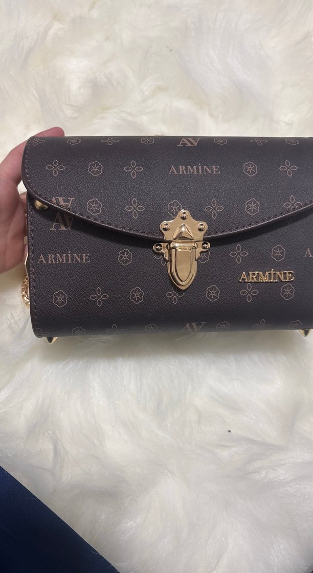 Kahverengi deri, baskılı desenli, zincir detaylı kadın çantası. Klasik elegans ve bohem tarzıyla günlük kullanıma uygundur. ARMINE markası bulunur.