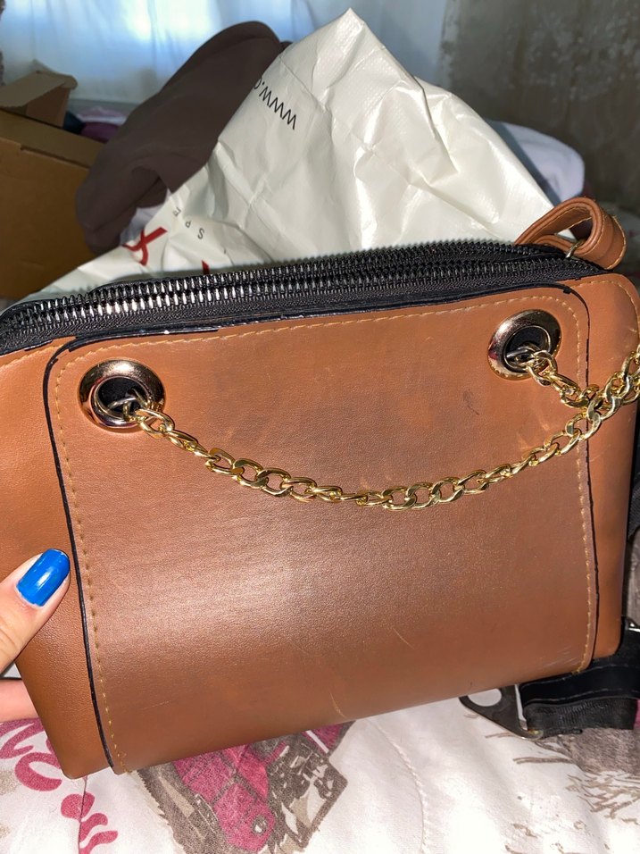 Kahverengi deri kadın çanta, zincir detaylı ve fermuarlı. Parizyen tarzı, gündelik ve sokak modasına uygun koyu renkte, desensiz model.