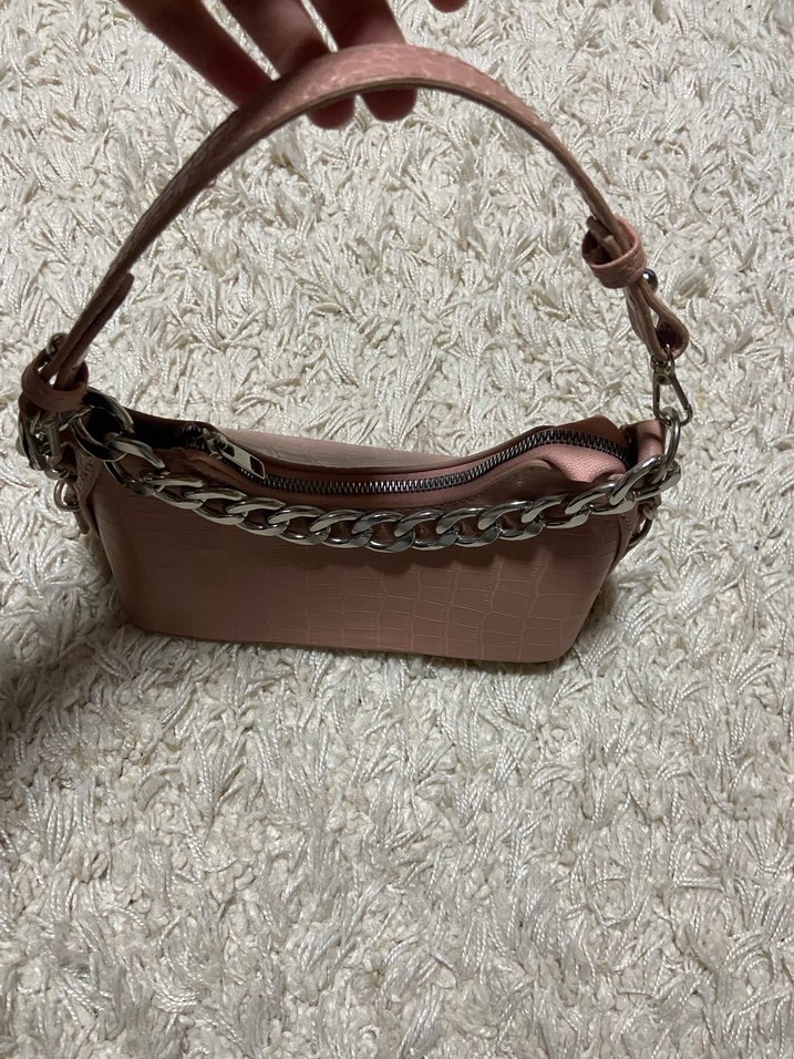 Pastel kahverengi yılan desenli deri kadın çantası, zincir detaylı ve minimalist tarzda günlük kullanıma uygun.