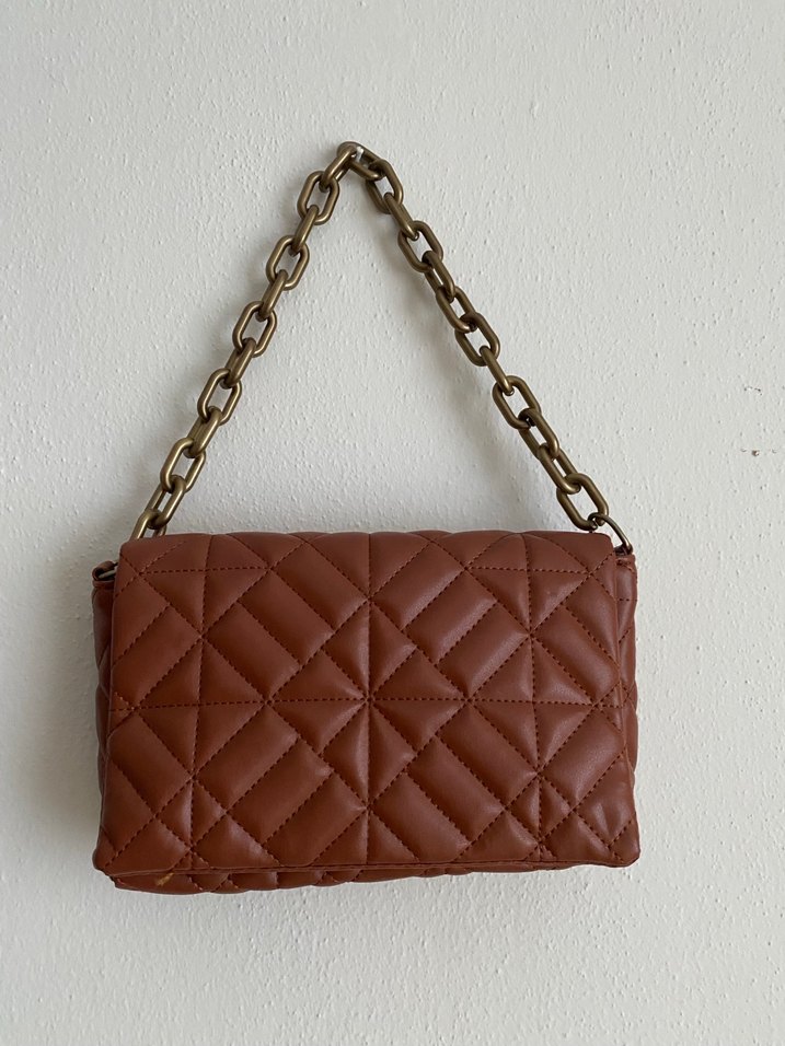Kahverengi deri çanta, zincir askı ve kapitone desene sahip. hediye olarak geldi tarzıma uymadığı için hiç kullanmadım