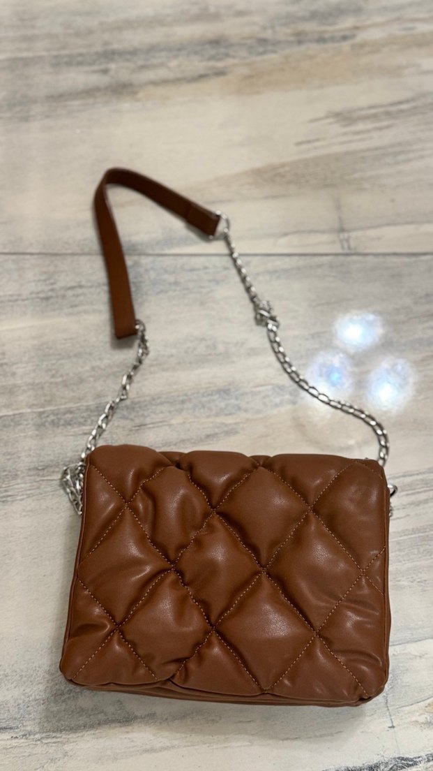 Kahverengi deri kadın çanta, zincir askı ve kapitone dikiş detaylarına sahiptir.