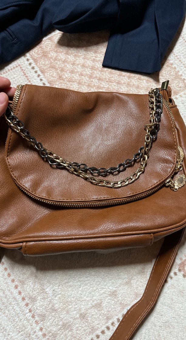 Parlak zincir detaylı kahverengi deri kadın çanta, bohem tarzıyla günlük kullanıma uygun.
