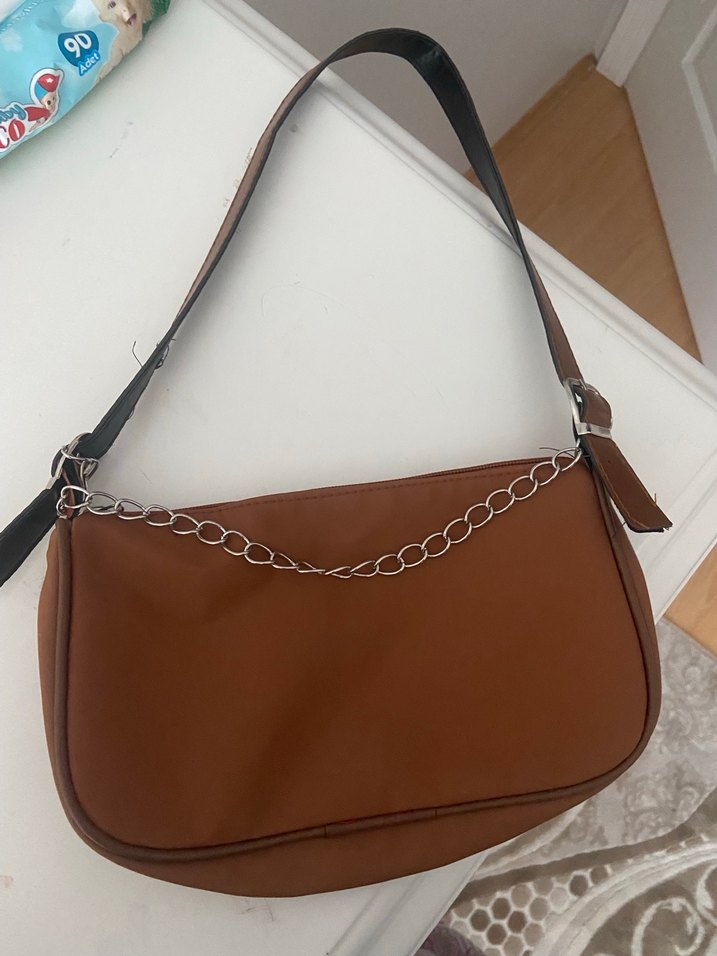 Parlak kahverengi deri kadın çanta, zincir detaylı, günlük sokak tarzına uygun minimalist ve trend görünümlü çanta .