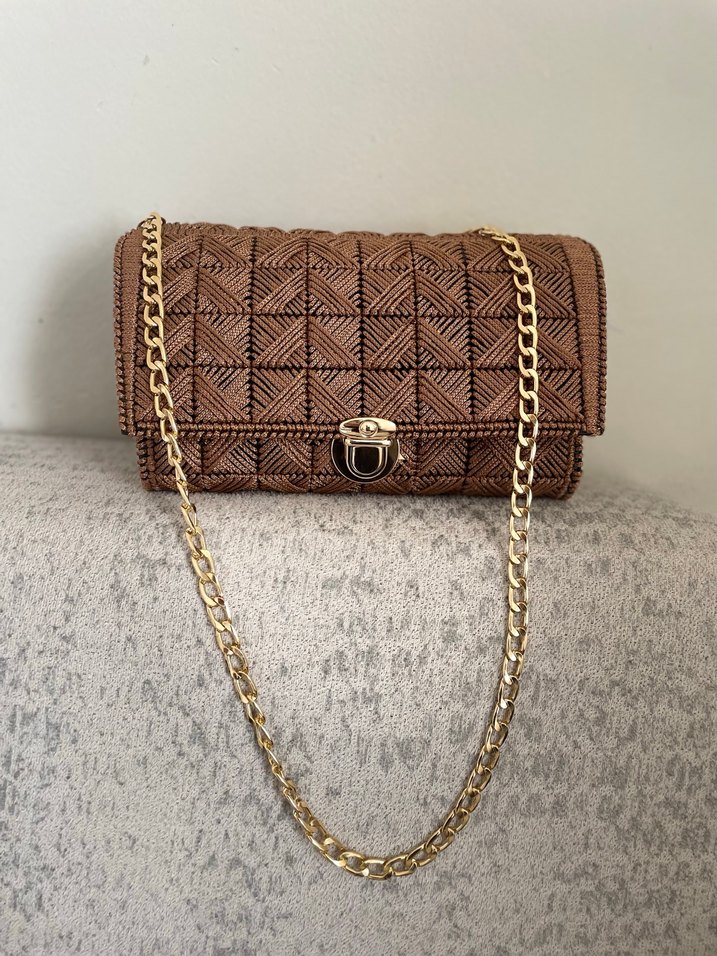 Kahverengi deri kadın çanta, parlak yılan deseni ve altın zincir detayıyla bohem tarzı ve klasik zarafeti bir araya getiriyor.