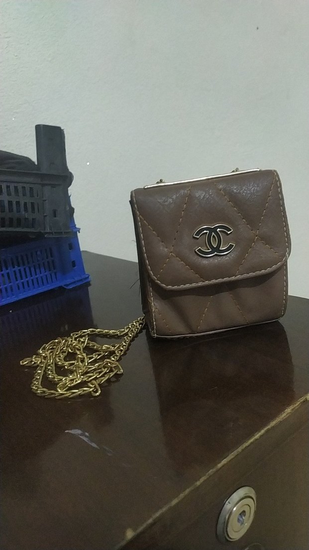 Kahverengi deri, zincir detaylı kadın çanta. Gri tonlu yılan deseni ve küçük boyutuyla günlük kullanıma uygundur.