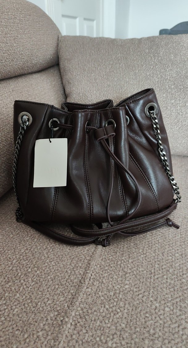 Kahverengi deri, zincir detaylı kadın çantası. Paris tarzı sokak giyimine uygun, desensiz ve günlük kullanıma elverişli.