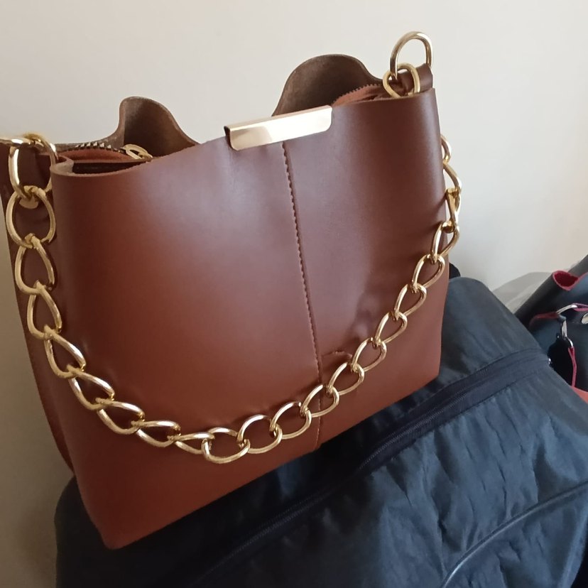 Parlak kahverengi deri ve zincir detaylı, minimalist ve çağdaş tarzda kadın çantası, günlük kullanım için uygundur.