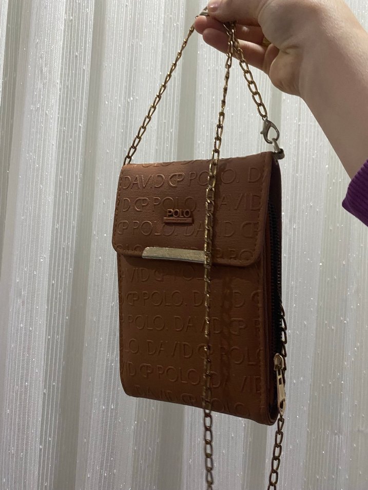 Kahverengi deri çapraz çanta, zincir detaylı ve kabartma logo baskılı, günlük sokak stili için uygun.