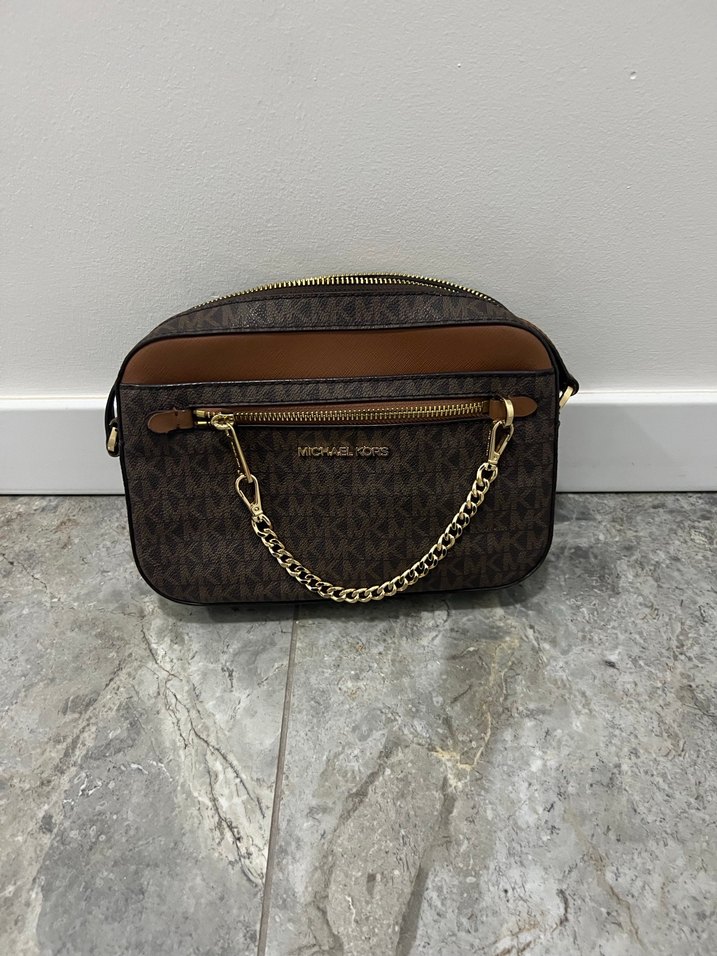 Kahverengi deri, baskılı desenli ve zincir detaylı çapraz çanta. Fermuarlı kapanışlı, modern klasik stil ve günlük kullanım için uygun. Fermuar kısımlarında deformesi vardır. Fotoğrafını çektim