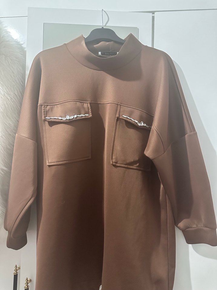 Kahverengi deri sweatshirt, bol kesim, uzun boy ve boğazlı yaka ile. Ön cep zincir detaylarıyla sokak stiline uygun.