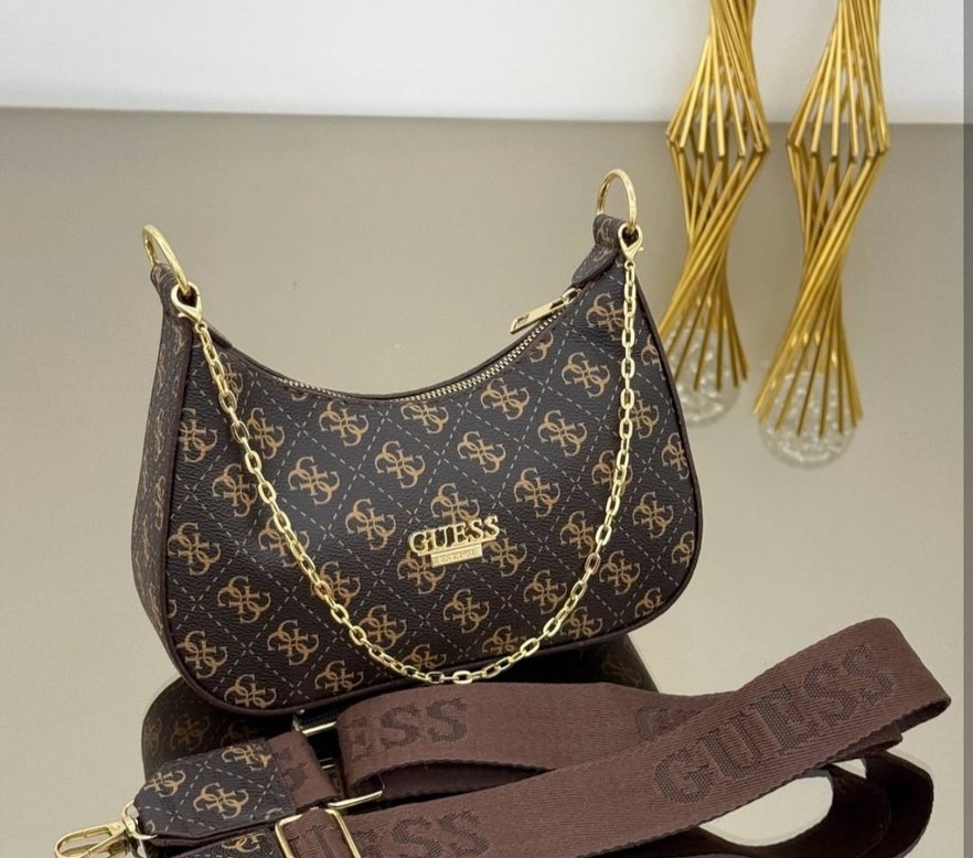 Kahverengi deri, baskılı desenli Guess çanta, parlak altın zincir detayıyla klasik şıklığı sokak stiliyle buluşturuyor.
