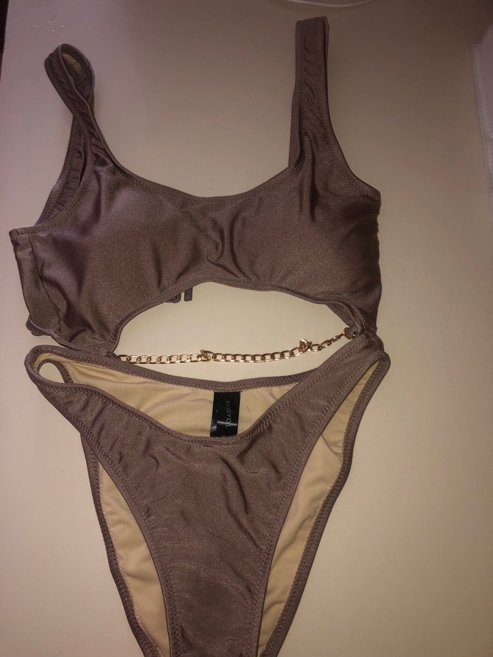 Parlak kahverengi, zincir detaylı ve askılı, normal boyda, atletik tarzda kadın bikini. ️ Altı hiç kullanılmadı 34 beden olmadığı için satıyorum.