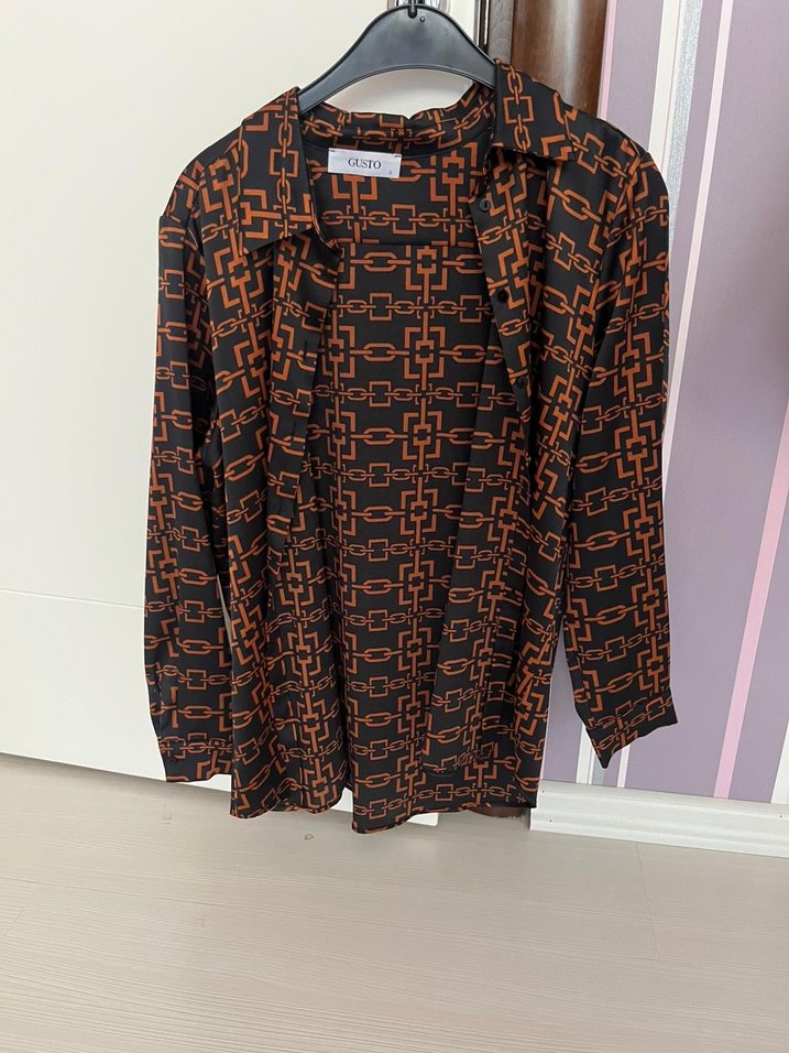 Sentetik kumaştan, zincir detaylı, uzun kollu ve salaş kesim kahverengi baskılı gömlek. Günlük sokak stili için uygun. Gusto dan aldım 38-40 beden