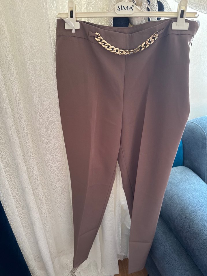 Kahverengi, zincir detaylı kadın kumaş pantolon. Normal boy ve regular fit, parlak sentetik kumaştan, iş ve günlük şıklık için uygundur. Vizon renktir sıfır kemer detaylı