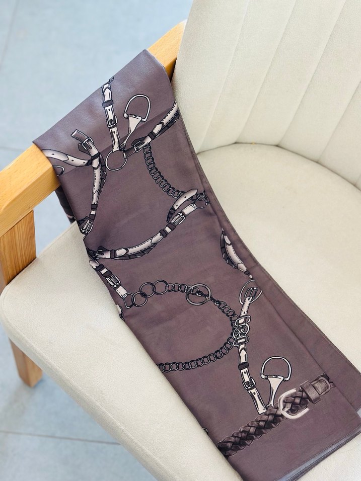 Kahverengi, ipeksi kumaştan yapılmış bu kadın fular, çağdaş zincir detaylarıyla trend belirleyenler için şık ve öncü bir görünüm sunar.