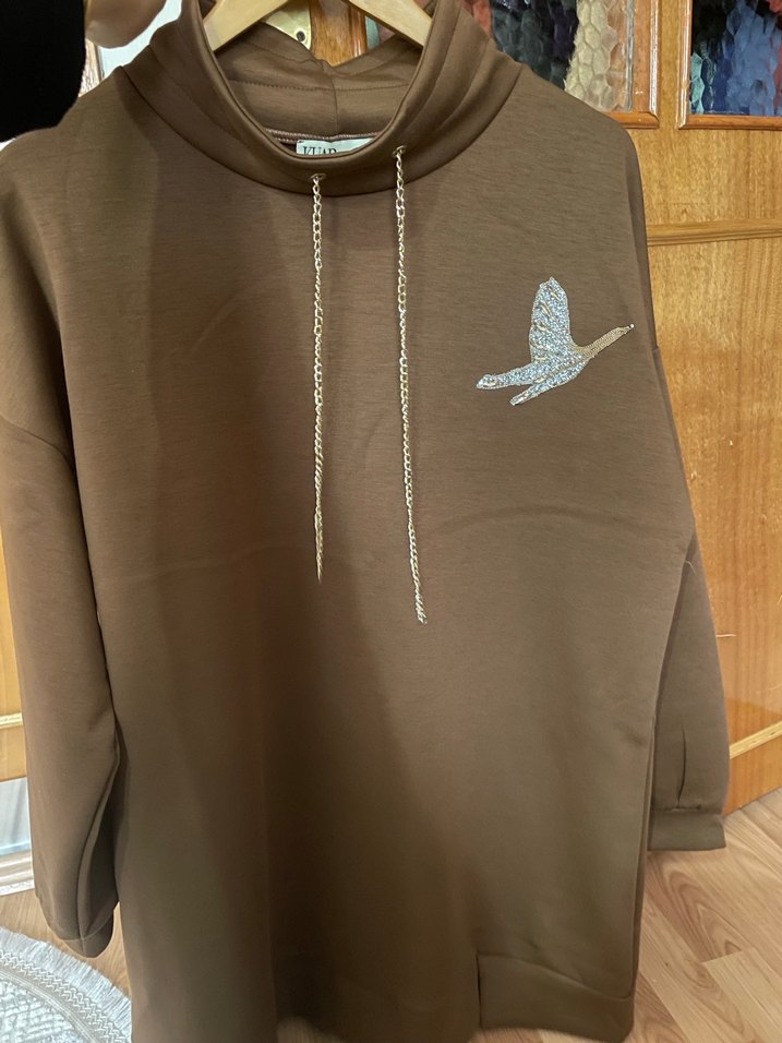 Uzun kollu, bisiklet yaka, zincir detaylı ve işlemeli kuş figürlü kahverengi triko sweatshirt. Günlük kullanıma uygun rahat kesim.