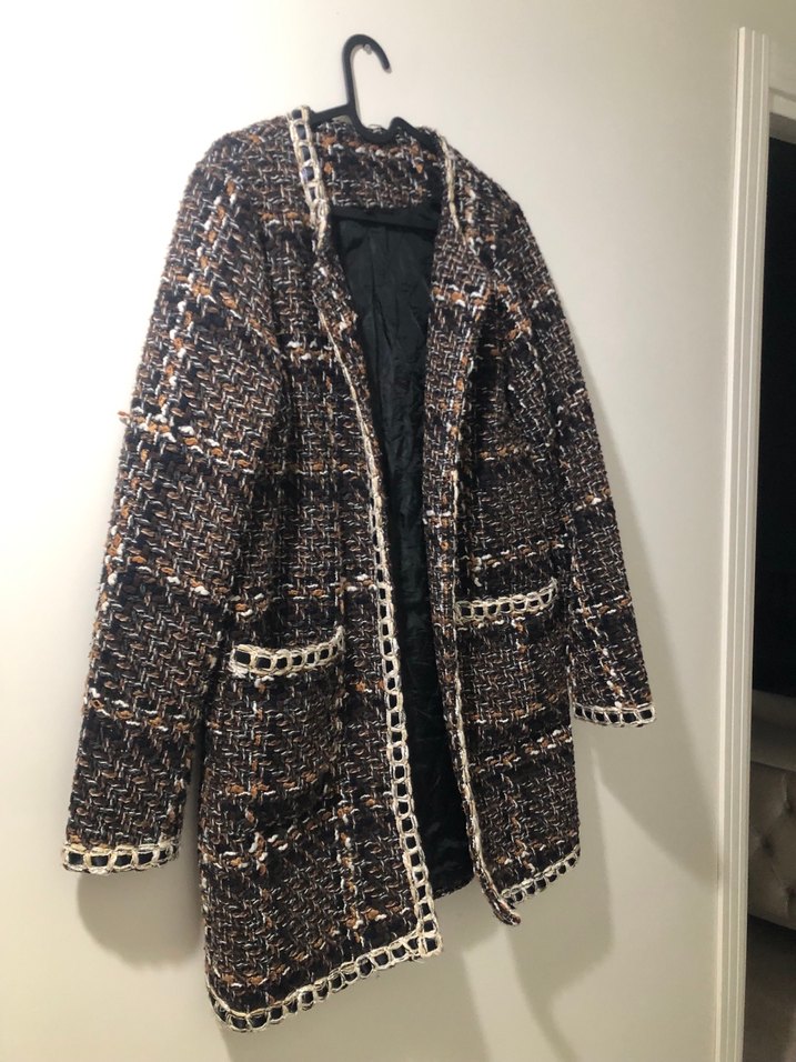 Kahverengi midi uzunlukta, zincir detaylı, regular fit kadın kaban. Uzun kollu ve yakası notched lapel olup, rahat sentetik kumaştan üretilmiştir. Kalıbı oldukça iyi. Xl beden diyor lakin ben 59 kg 1.69 boyundayım bana gayet ideal oluyor.