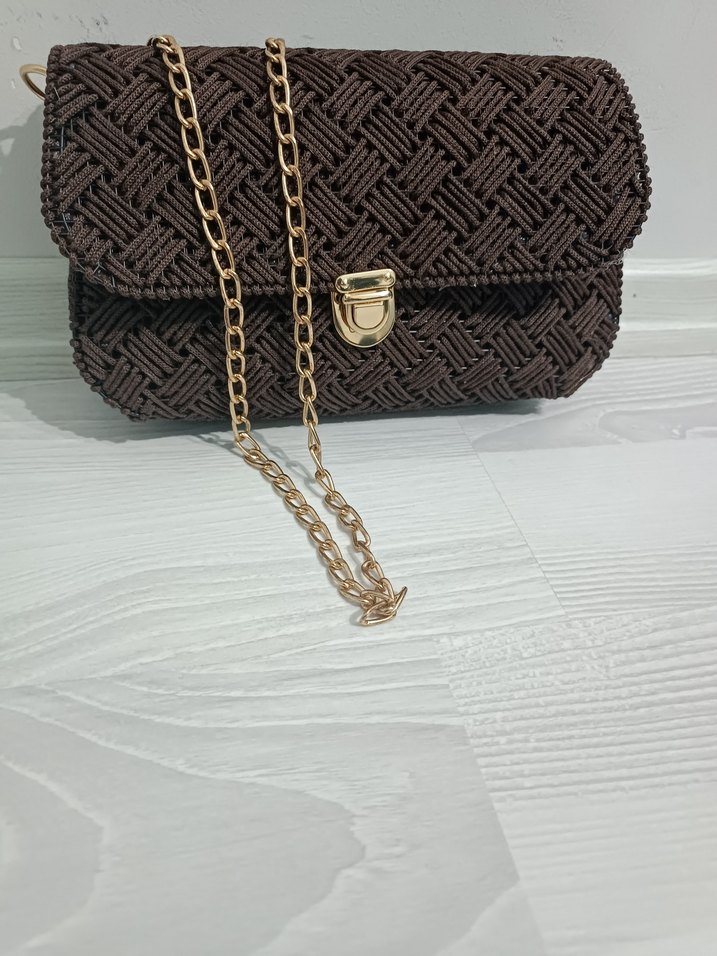 Kahverengi örgü dokulu, zincir detaylı ve kilitli kapaklı kadın çantası, minimalist bohem tarzda günlük kullanıma uygun.