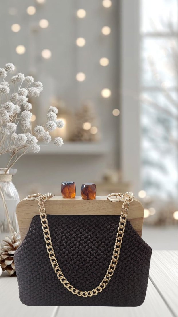 Kahverengi örgü dokulu kadın çantası, desenli ve altın renk zincir detaylı, minimalist ve modern klasik tarzı bir araya getirir.