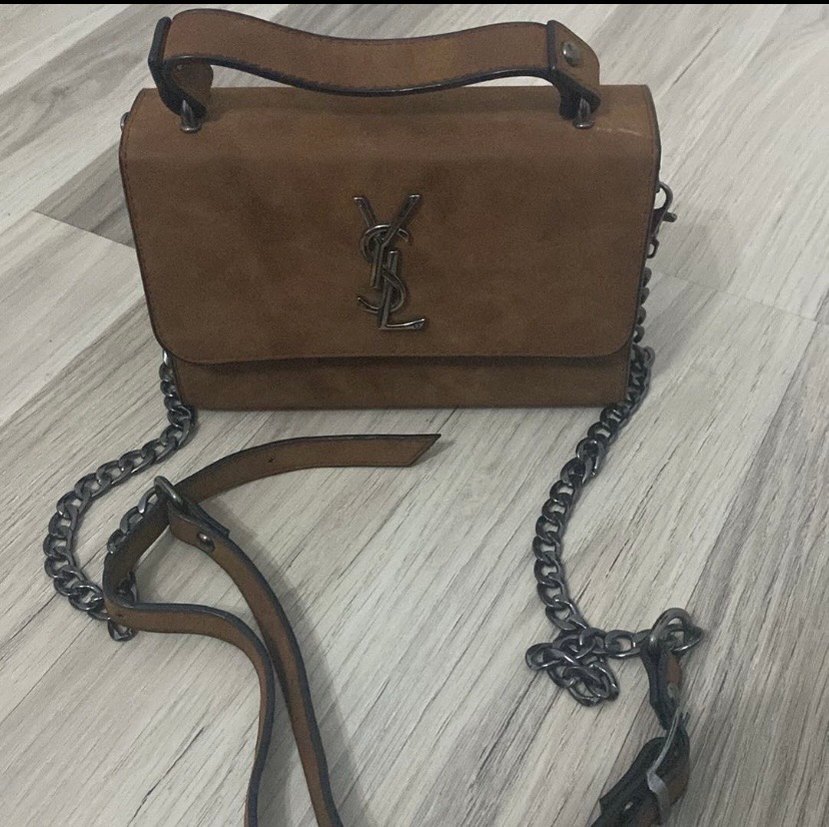 Kahverengi süet kadın çantası, zincir detaylı ve parlak baskılı desene sahip, trend sokak stili için uygun ayarlanabilen çanta.