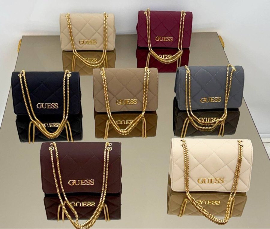 Kahverengi süet kadın çantası, parlak yüzey ve zincir detaylarına sahip, kapitone desenli ve GUESS logosu bulunan modern klasik Paris tarzını yansıtıyor. (bby56)