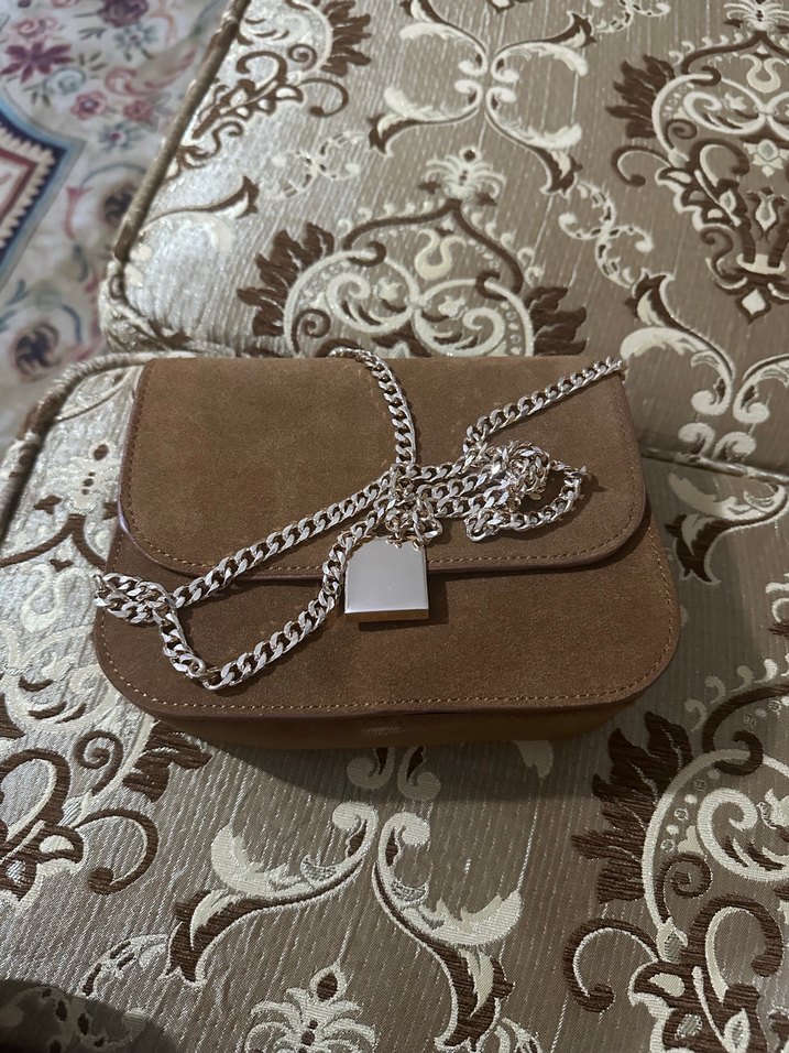 Kahverengi süetten yapılmış, zincir detaylı kadın çantası. Günlük kullanıma ve sokak stiline uygun, kilit aksesuarı ve hafif yılan derisi deseni bulunur. Bir kere taktim