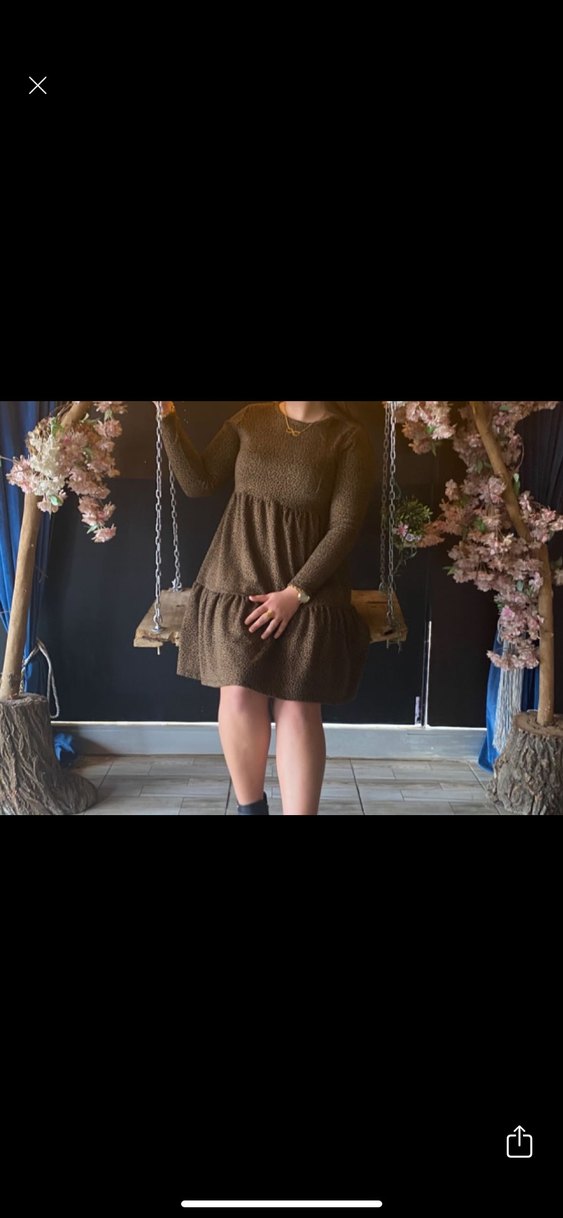 Kahverengi, zincir detaylı, triko kumaştan yapılmış, salaş kesim midi elbise. Bisiklet yakalı ve askılı kolludur, rahat ve normcore tarzda günlük kullanım için uygundur.