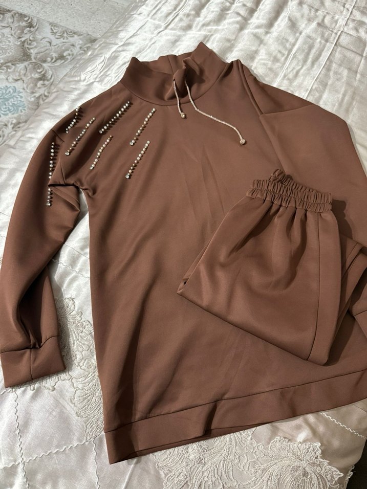 Parlak kahverengi, yüksek yakalı ve uzun kollu, zincir detaylı, bol kesim kadın eşofman takımı. Lastikli bel pantolonuyla rahat ve şık bir seçenek.