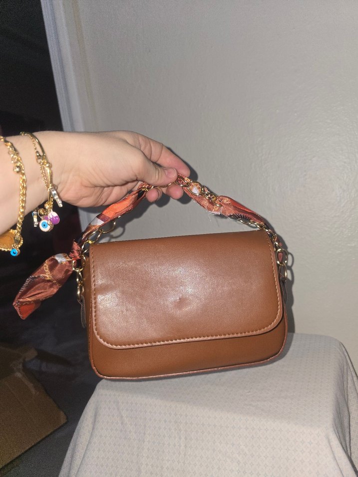 Zincir detaylı, yılan desenli kahverengi deri çanta, trend sokak stiline uygun şık bir parça.