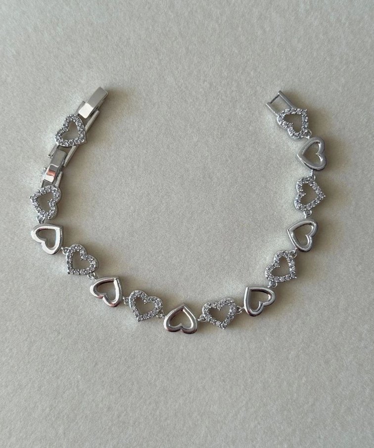 Zincir detaylı, gri ve beyaz tonlarda kalp şeklinde bağlantılara sahip bileklik, klasik zarafet ve sokak stilini romantik akşamlara taşıyor.