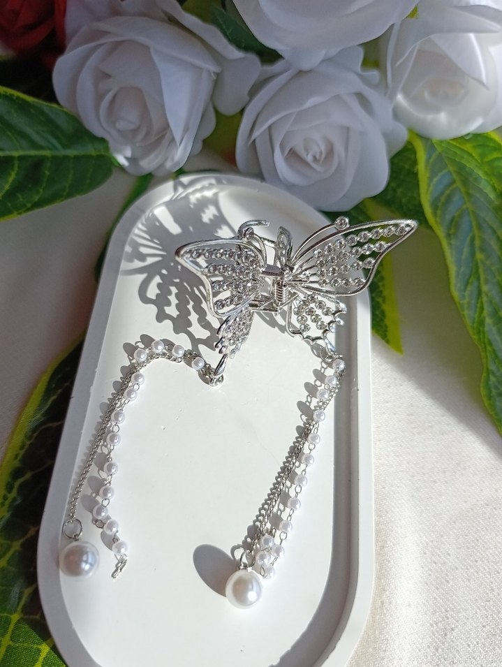 Zincir detaylı kelebek figürlü metal saç aksesuarı, inci süslemeleriyle klasik ve bohem tarzı bir araya getirir. Parlak ve şık görünüm için ideal.