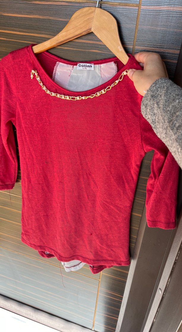 Kırmızı renkli, zincir detaylı crew neck bluz . Uzun kollu, normal boyda ve bol kesimdir. Keten kumaştan olup, günlük sokak tarzına uygundur. Marka: Galins.