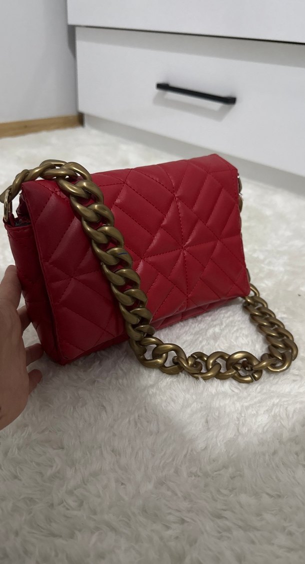 kırmızı deri kadın çanta, zincir detaylı ve desen içermeyen şık bir tasarıma sahiptir. Cesur ve Paris tarzını yansıtan sokak stiline uygundur. Sıfırdır
