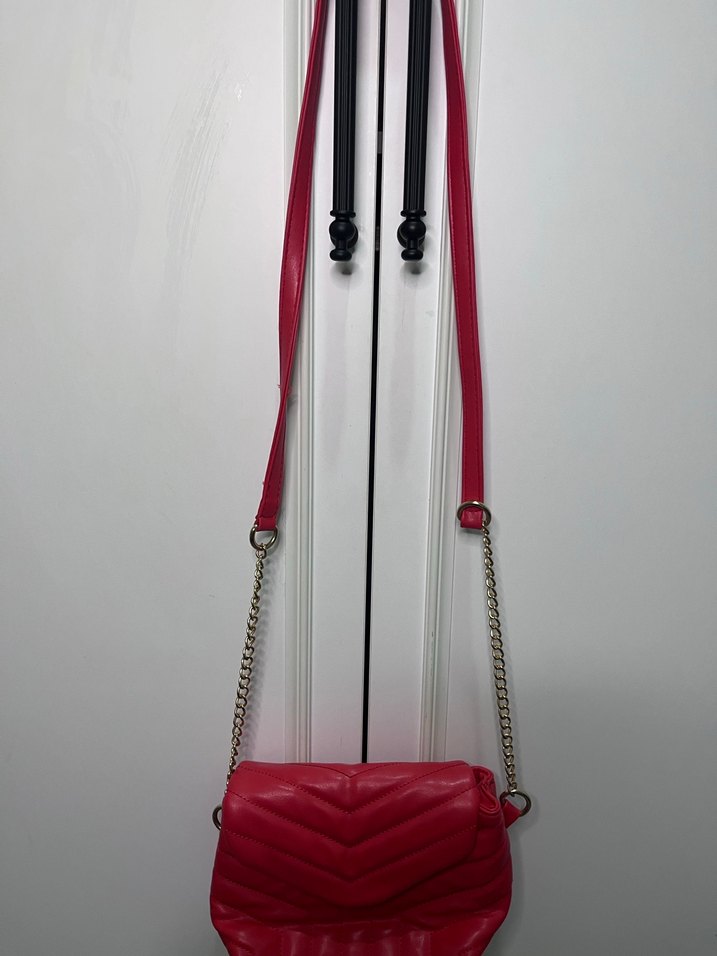 Kırmızı deri, çizgili desene sahip ve zincir detaylı kadın çantası, cesur sokak modası için uygun.Koton ürünüdür etiketi koptu sıfırdır.