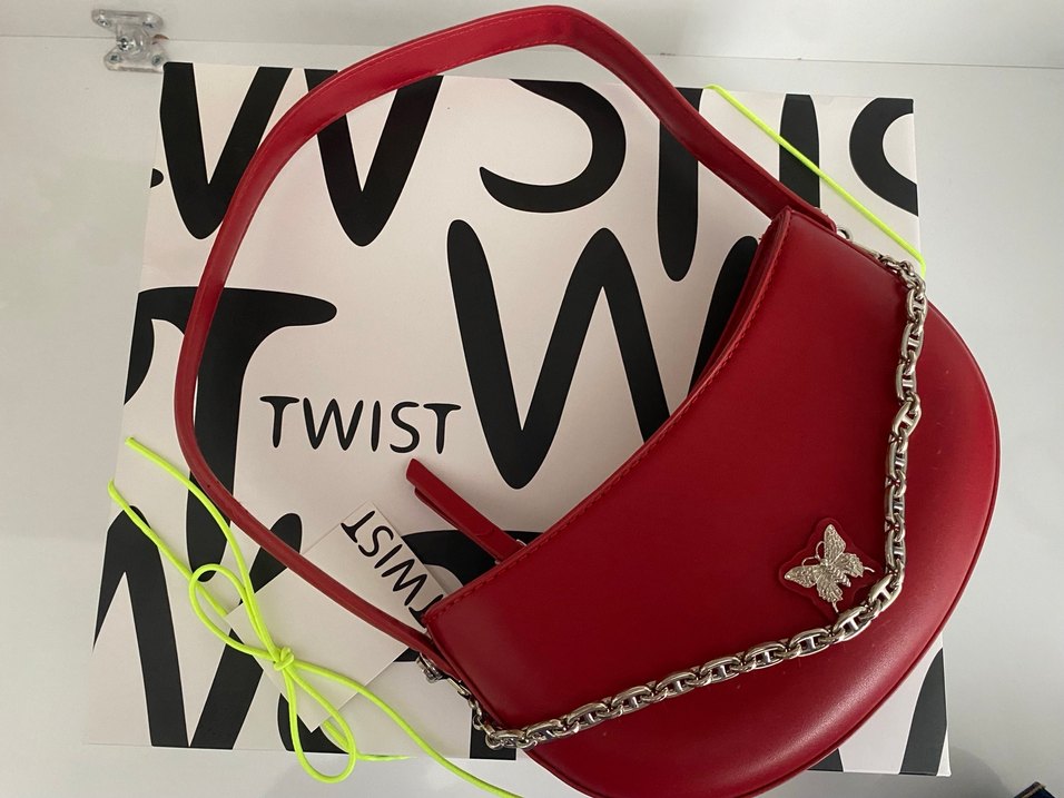 Kırmızı deri kadın çanta, zincir detaylı ve üzerinde 'TWIST' ile 'LSIM' baskılı desen bulunur. Cesur, avangart sokak stili ve spor kullanım için uygundur.