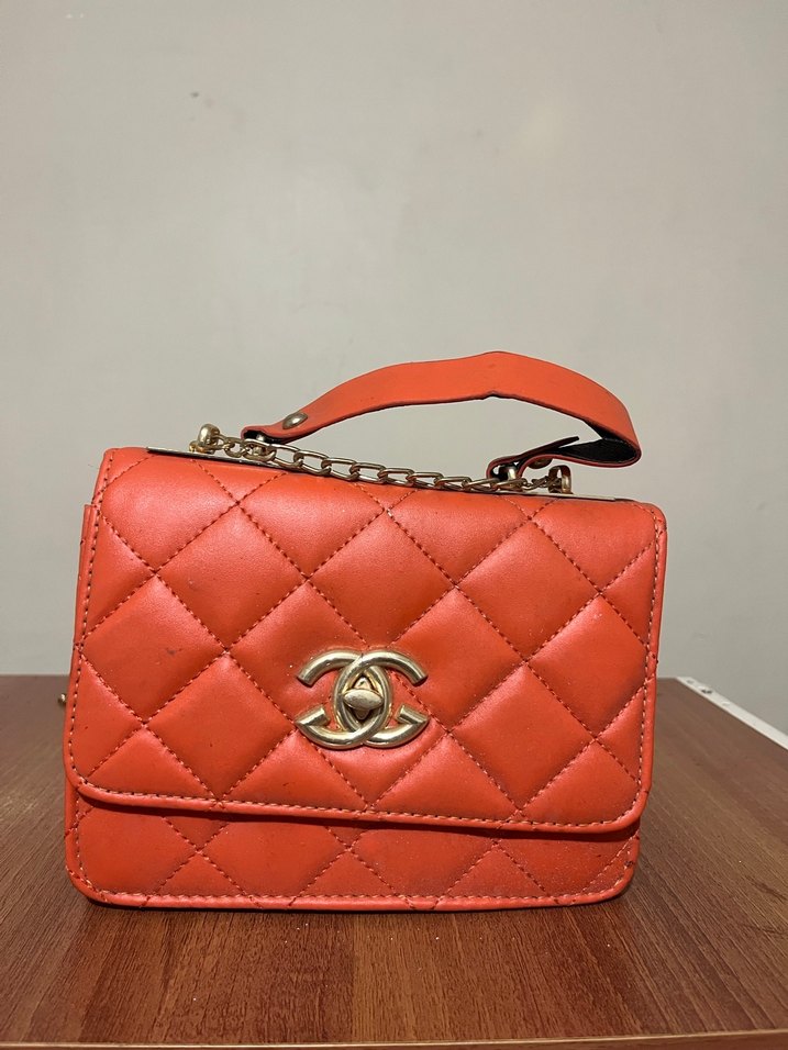 Kırmızı deriden yapılmış, zincir detaylı ve kapitone dikişli kadın çantası. Modern klasik tarzda, günlük kullanıma uygun renkli ve baskılı tasarım.
