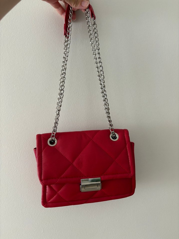 Kırmızı deri, zincir detaylı kadın çanta. Modern klasik tarzda, cesur Paris esintili, günlük kullanıma uygun.