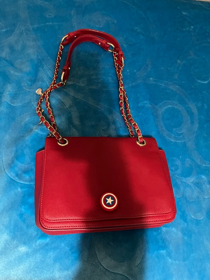 Parlak yüzeyli kırmızı deri kadın çanta, zincir detayları ve baskılı deseniyle günlük kullanım ve sokak stiline uygundur. Cesur ve klasik tasarım.beymen marka kırmızı çanta