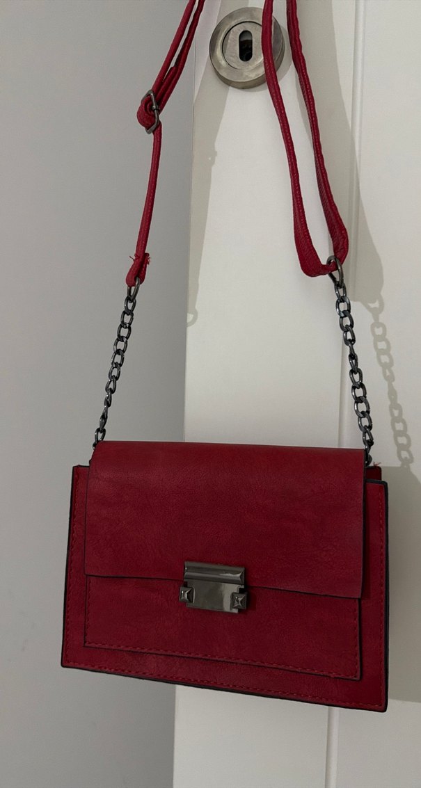Zincir detaylı, kırmızı deri kadın çanta. Minimalist ve çağdaş tasarımıyla günlük kullanıma uygun, cesur bir modeldir. HİÇ KULLANILMAMIŞTIR