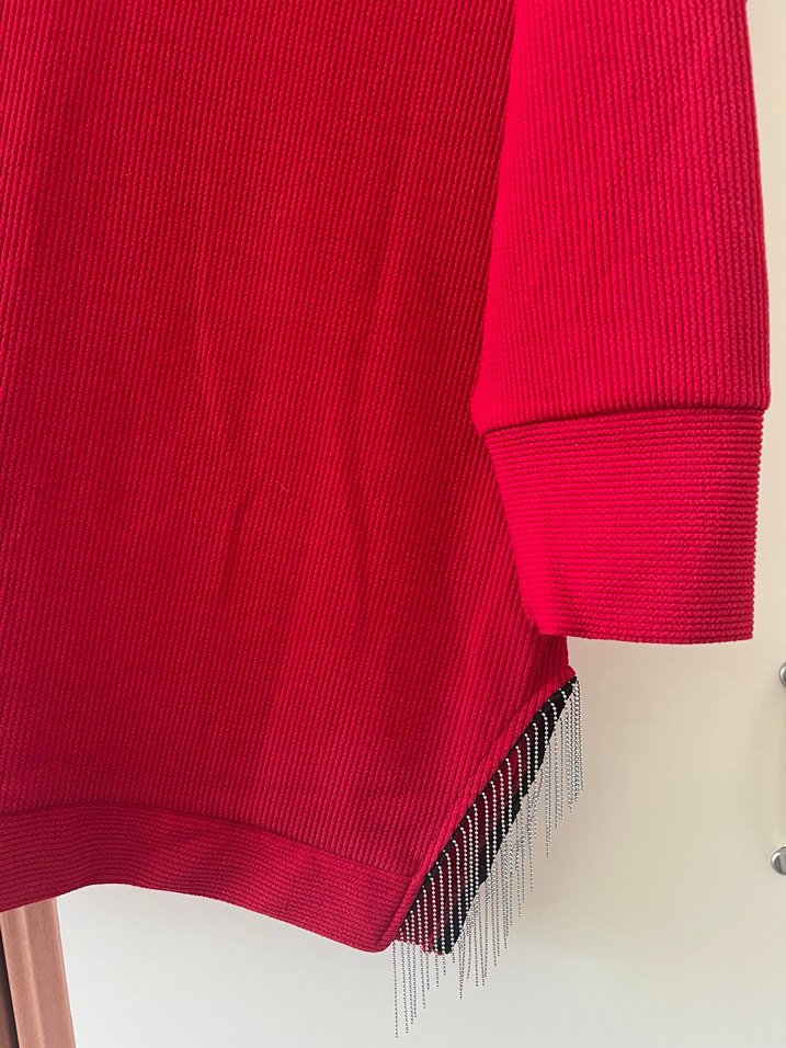 Uzun kollu, kayık yaka ve bol kesime sahip kırmızı kadın kazağı. Renkli nakış ve yanlarda zincir detayları bulunur. Sentetik kumaştan, rahat sokak stili için uygun.