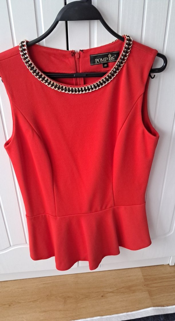 Zincir detaylı, kolsuz kırmızı bluz, parlak sentetik kumaştan, yuvarlak yakalı ve normal midi uzunlukta. Ofis için uygun, beli oturan ve etek ucu volanlı.