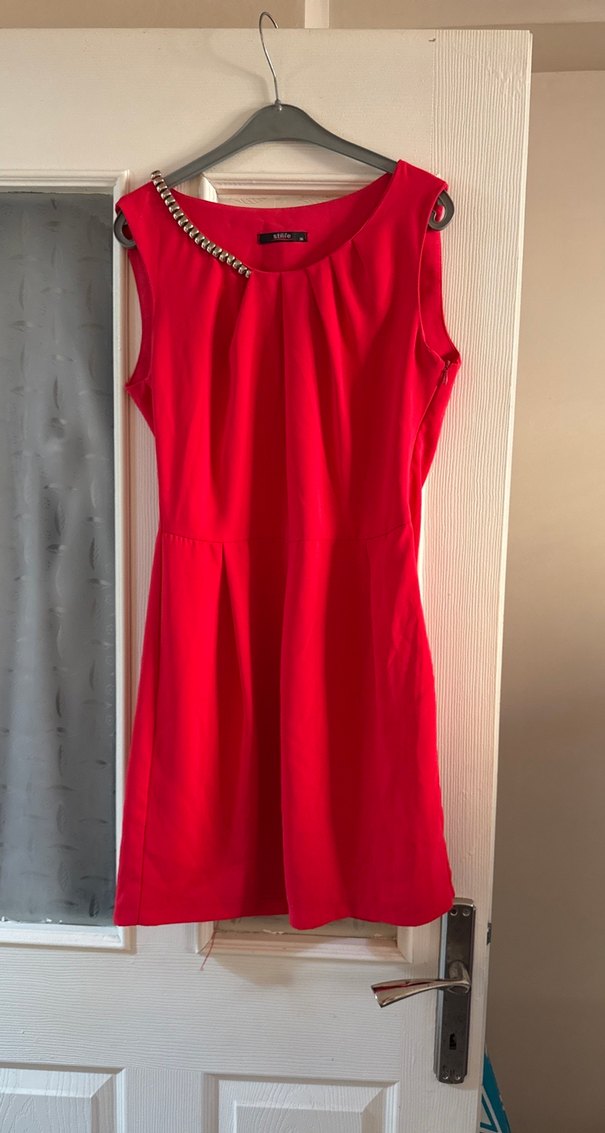 Kolsuz, V yakalı, zincir detaylı kırmızı midi elbise. İnce kesimi ve parlak rengiyle dikkat çeker. ️