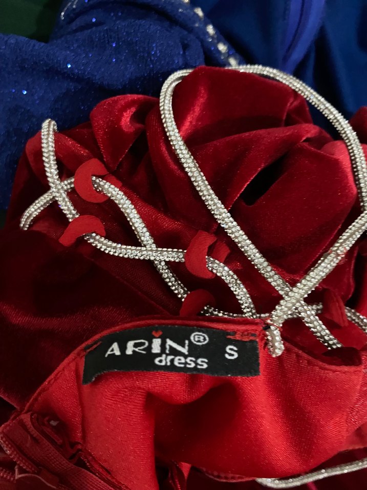 Renkli nakışlı ve zincir detaylı bu kadın broş, düğün ve sokak tarzına avangart bir dokunuş katıyor. Üzerinde 'ARINO dress' etiketi bulunur.