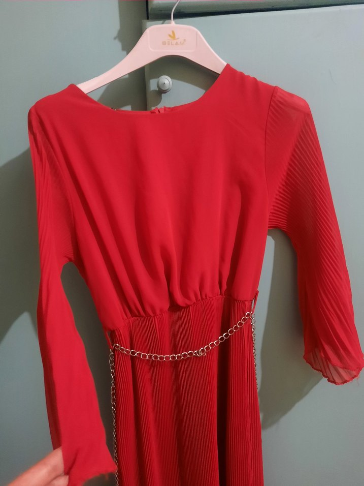 Kırmızı, uzun kesim kadın elbisesi. Dar kesim, yuvarlak yaka ve ince askılı kollara sahiptir. Romantik akşamlar için uygundur. ❤️ zincir Kemer dahil değildir.