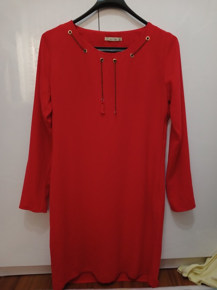 Zincir detaylı, uzun kollu kırmızı midi tunik. Salaş kesim ve düz dokulu sentetik kumaştan, gündelik kullanıma uygun.