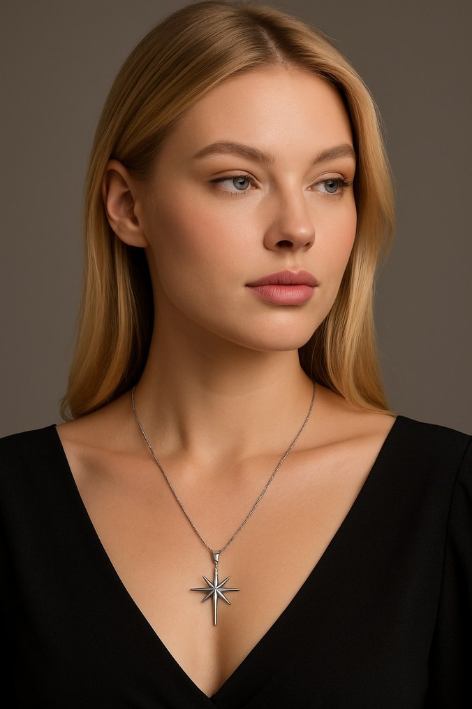 Gri renkte, zincir detaylı kısa uzunlukta etnik yıldız kolye. Bej tonları ve günlük kullanım için uygun, çağdaş ve cesur tasarım. ✨