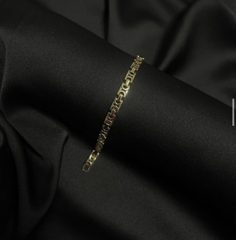 Cm klasik zarafeti yansıtan, zincir detaylı altın bileklik. Koyu yılan deseni ve çağdaş minimalist tarzla romantik akşamlar için uygun.