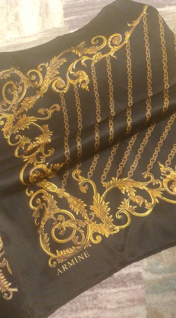 Kadınlar için ipek yumuşaklığında, koyu zemin üzerine altın renkli zincir ve çiçek desenleriyle klasik Paris esintili eşarp ✨