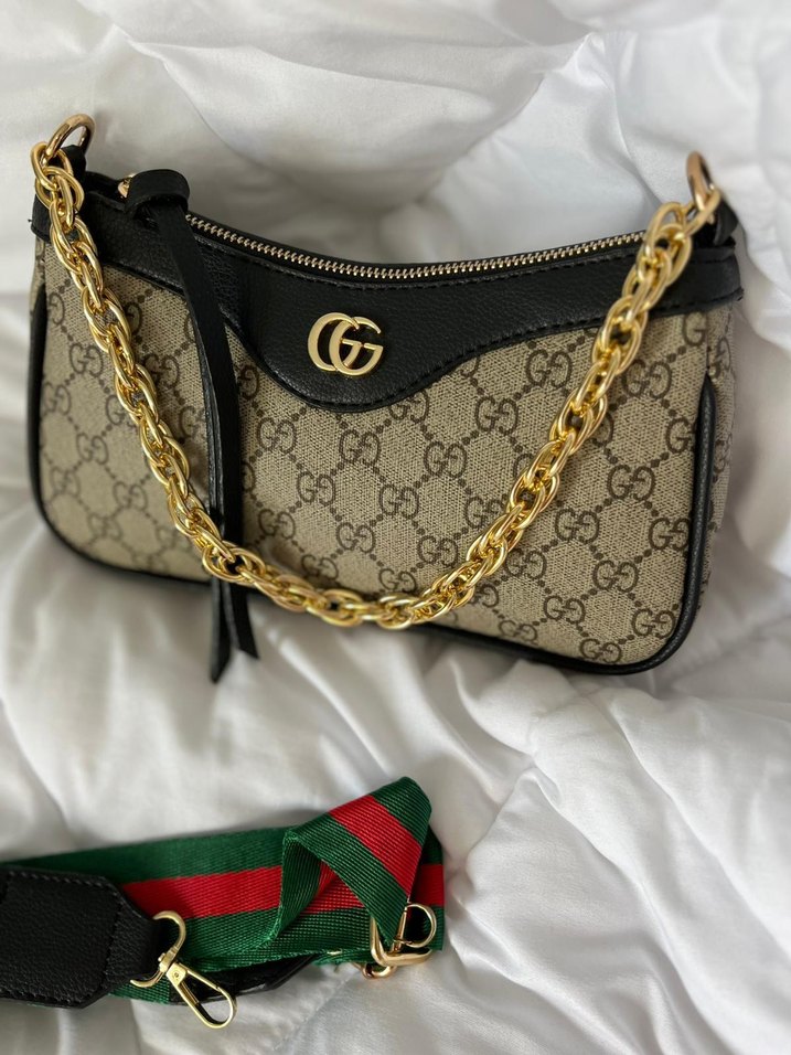 Koyu renkli baskılı sentetik kumaştan yapılmış, altın zincir detaylı klasik kadın çantası. Yeşil ve kırmızı detaylı çıkarılabilir askısı vardır, günlük kullanıma uygundur.