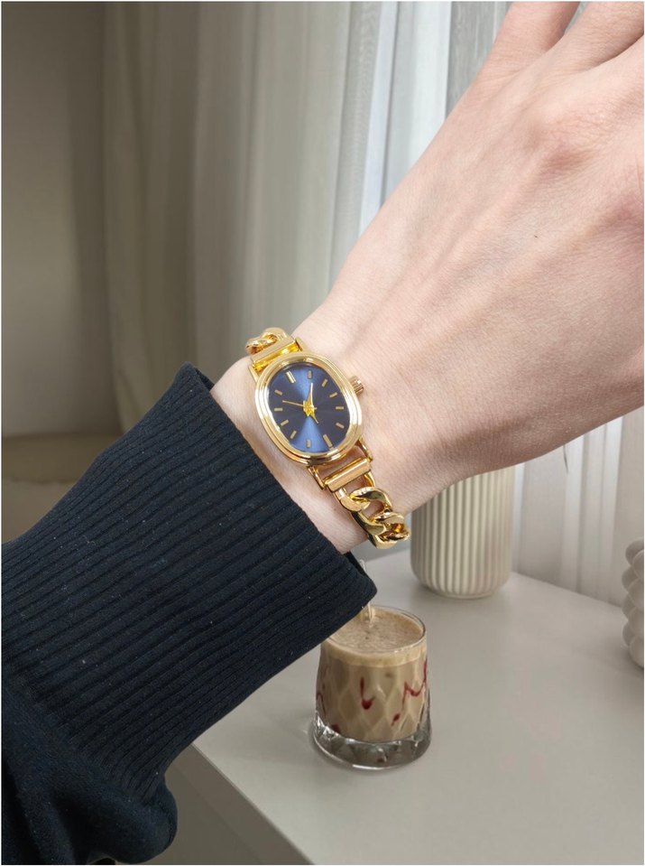 Parlak altın zincir kayış ve mavi kadranıyla klasik zarafeti modern çizgilerle buluşturan kadın saati. ⌚